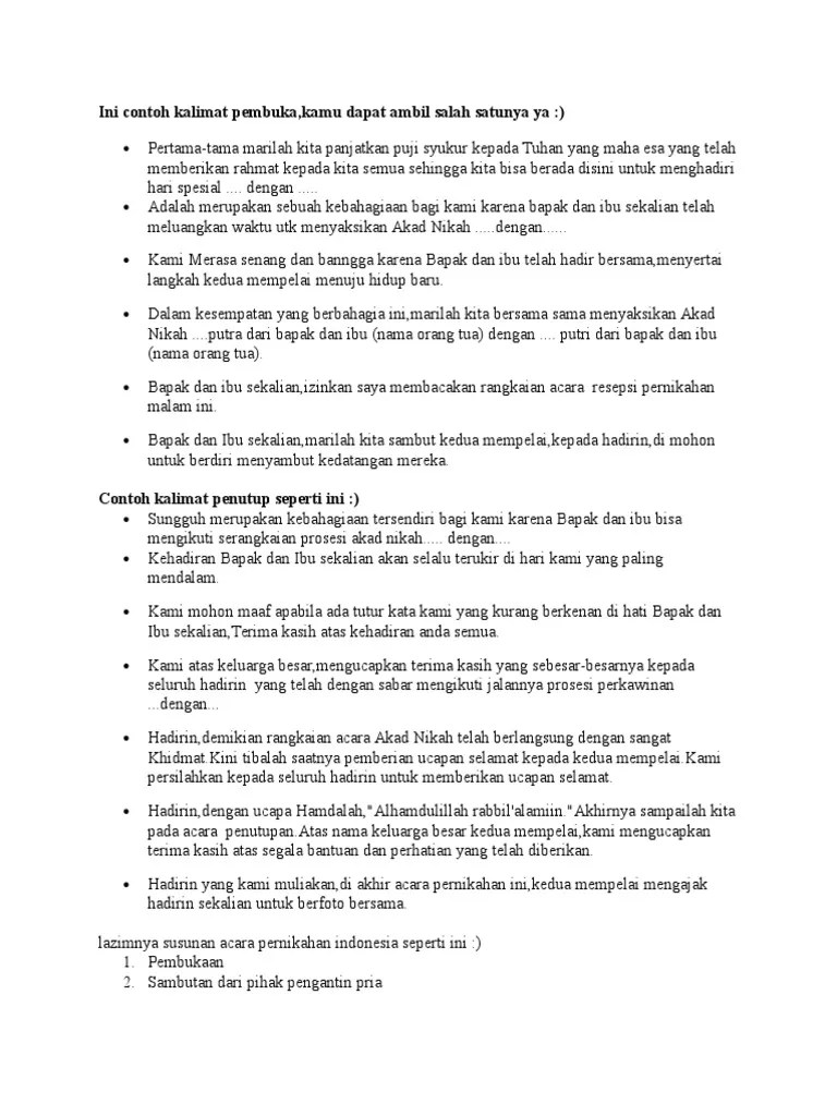Kata Sambutan Acara Nikahan. Atas nama keluarga besar pihak perempuan, kami juga sebelumnya mohon maaf jika ada sesuatu yang kurang berkenan dalam acara resepsi pada hari . Untuk memberikan kesan yang baik, maka sebaiknya anda . Bismillahi rahmanirrahim assalamualaikum warahmatullahi wabarakatuh. Para hadirin dan para undangan sekalian yang kami hormati, khususnya keluarga kedua mempelai yang berbahagia. Menggunakan format yang serupa intip deh contoh kata sambutan acara pernikahan yang mewakili pihak perempuan berikut ini assalamualaikum .